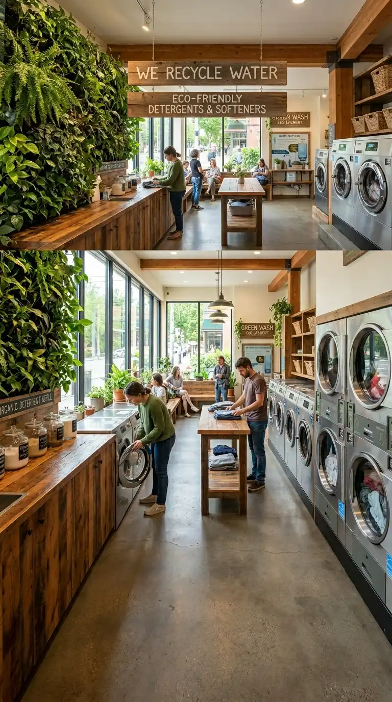 An eco-friendly laundry shop emphasizes sustainability. Use energy-efficient washers and dryers. Install greywater recycling systems and use eco-friendly detergents. Decorate with reclaimed wood, living walls, and natural light. Use signage to educate customers about your green practices. The eco-friendly design appeals to environmentally conscious customers.
