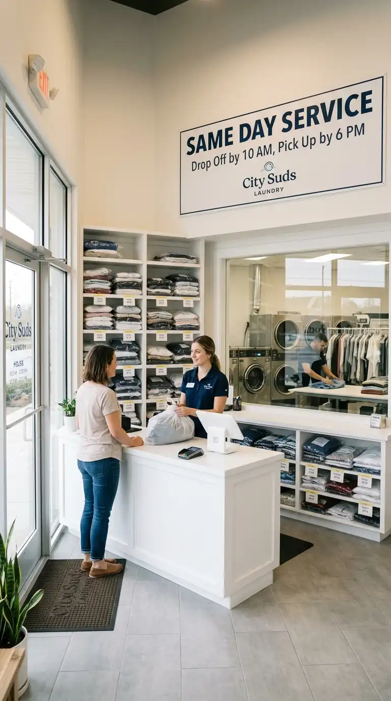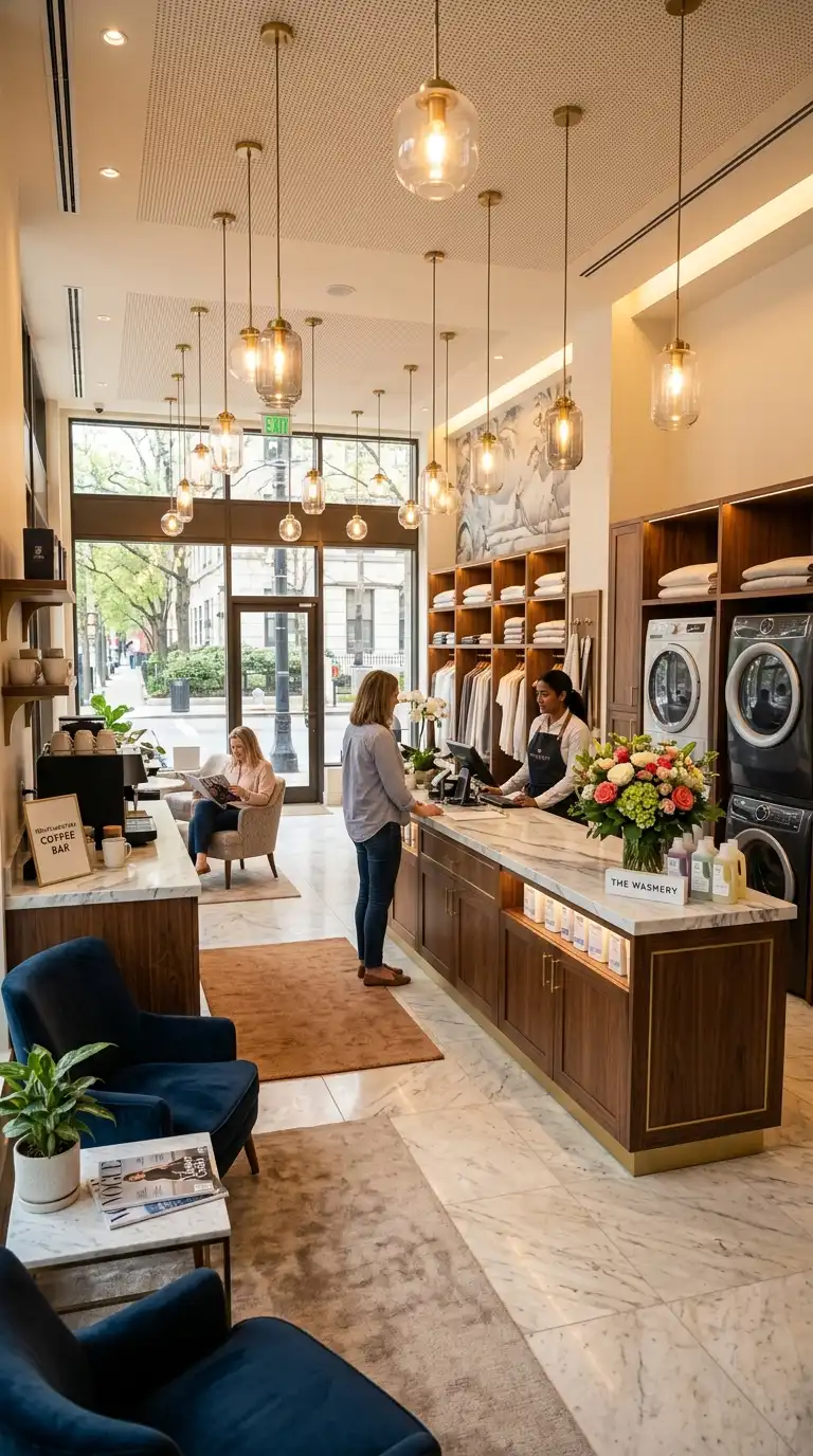 A high-end wash-and-fold boutique targets customers willing to pay a premium for service and ambiance. Use marble or quartz countertops, custom cabinetry, and comfortable upholstered seating. Offer complimentary coffee or tea. Use soft, warm lighting and high-end finishes. The boutique feels more like a spa than a laundromat.
