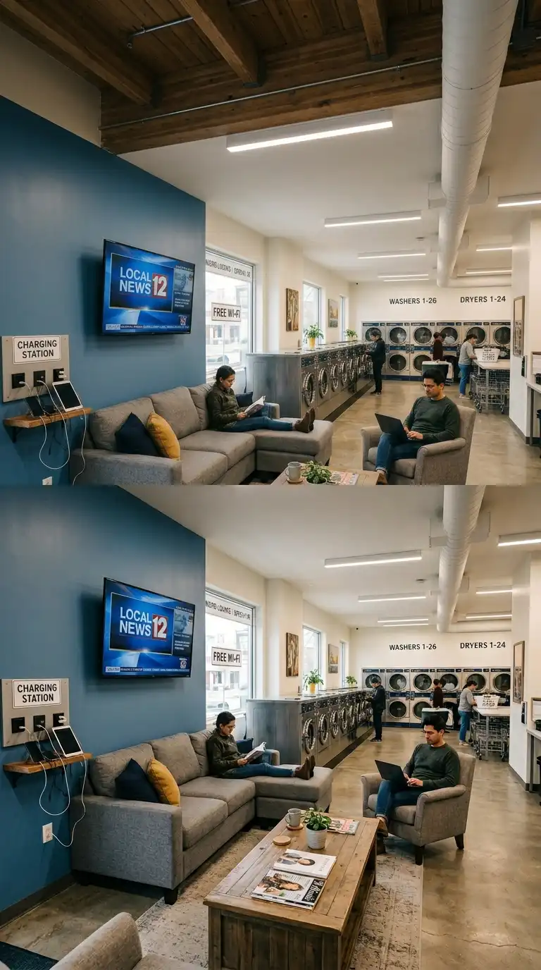 A self-service laundromat with a comfortable lounge area encourages customers to stay while they wait. Use couches, armchairs, and coffee tables. Provide free Wi-Fi, charging stations, and a television. Offer vending machines for snacks and drinks. The lounge area makes the wait more pleasant and encourages customers to use more machines.