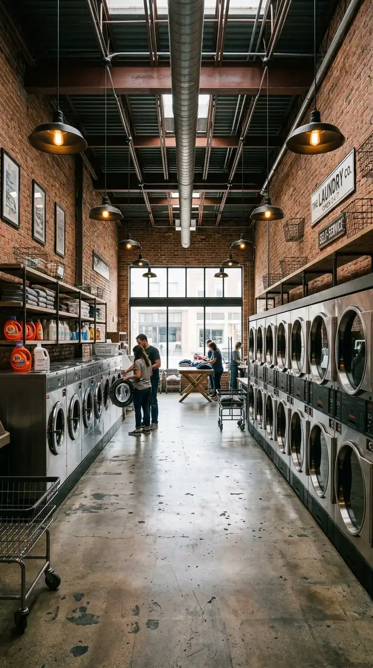 An industrial chic laundromat uses raw materials like exposed brick, metal pipes, and concrete floors. Use black metal shelving and industrial pendant lights. Choose commercial-grade machines in stainless steel. The industrial design feels edgy, modern, and durable.