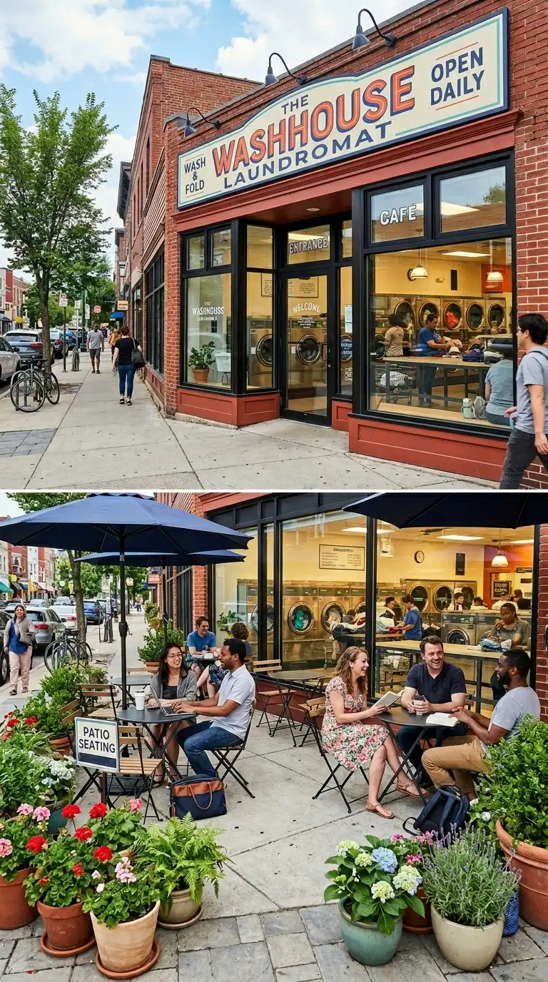 If your laundry shop has outdoor space, add a patio with seating. Customers can wait outside on nice days. Use weather-resistant furniture and add umbrellas for shade. Plant flowers or add potted plants to soften the space. Outdoor seating makes the laundromat feel more like a community gathering spot.