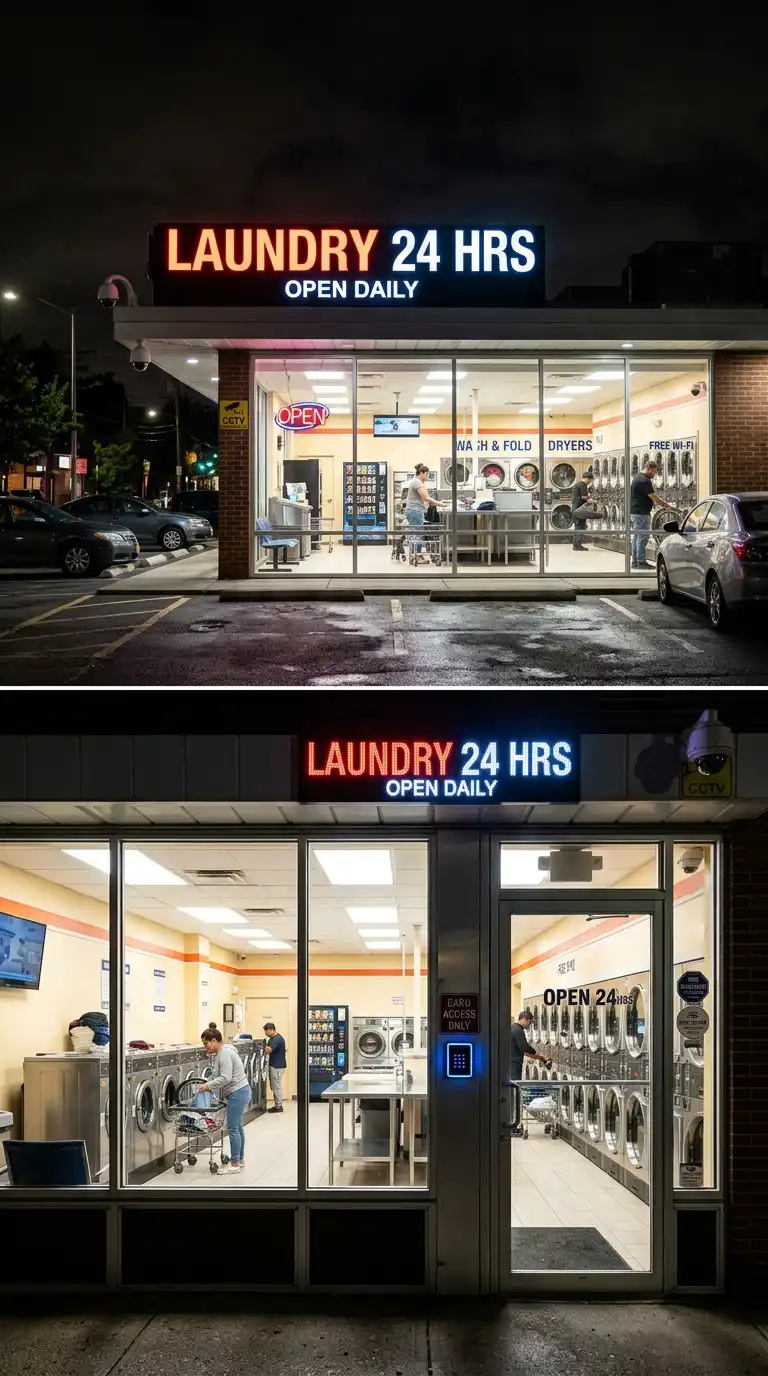 A 24-hour laundromat requires thoughtful design for safety and security. Use bright lighting throughout the interior and exterior. Install security cameras visible to customers. Use a card entry system for after-hours access. Use durable, easy-to-clean surfaces. The design should feel safe and well-monitored.