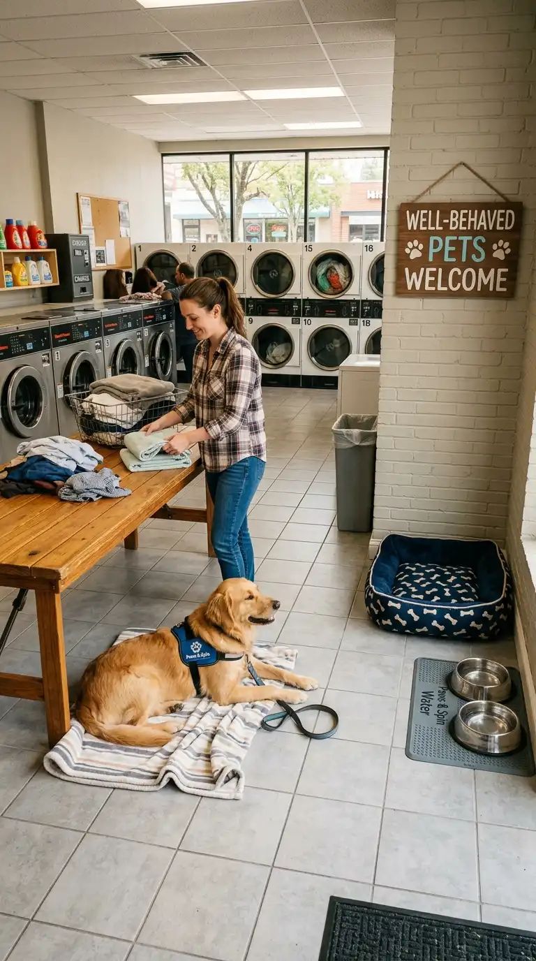A pet-friendly laundry shop welcomes customers with dogs. Use durable, easy-to-clean floors. Add water bowls and a small pet bed in the seating area. Use signage to indicate that well-behaved pets are welcome. This design appeals to pet owners who need to do laundry while walking their dogs.