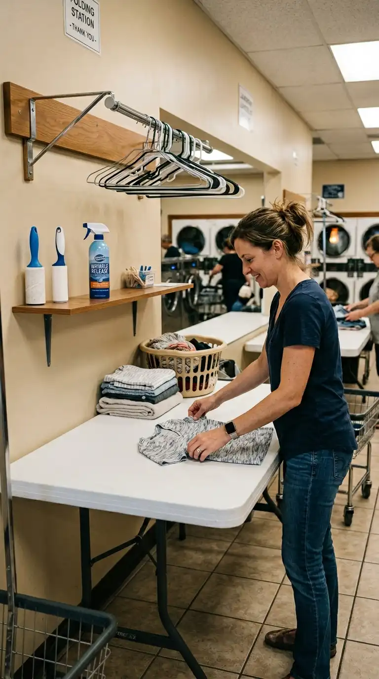Folding tables are essential for customers who want to fold their laundry on-site. Install long, wide tables at a comfortable height. Use durable, easy-to-clean surfaces like laminate or stainless steel. Position the tables near the dryers for convenience. Add a small shelf above each table for supplies like hangers and lint rollers.