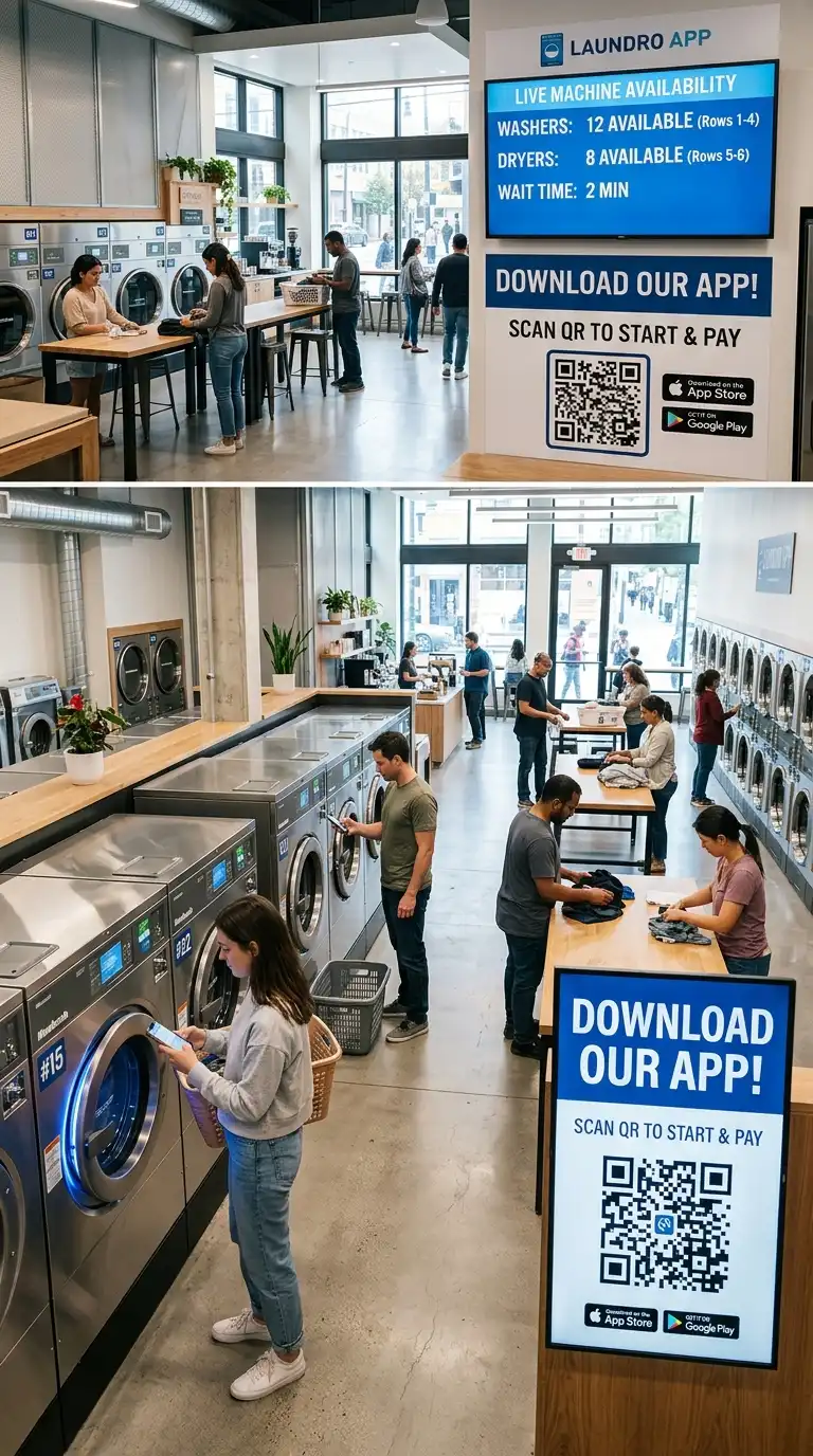 A modern laundry shop integrates with a mobile app for payment, machine availability, and notifications. Use app-connected machines that customers can reserve and pay for from their phones. Install a digital display showing which machines are available. The tech-forward design appeals to younger, tech-savvy customers.