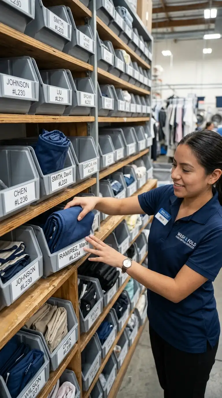 A laundry shop that offers subscription service for wash-and-fold customers can use a dedicated area for sorting and storing subscriber bags. Use labeled bins or shelves for each subscriber. The design should be efficient for staff and reassuring for customers. A sign explaining the subscription service can attract new members.