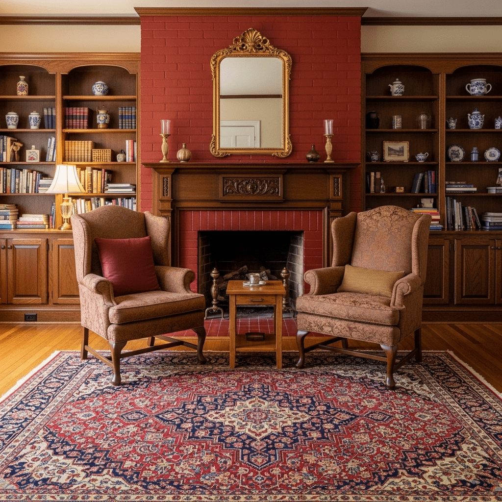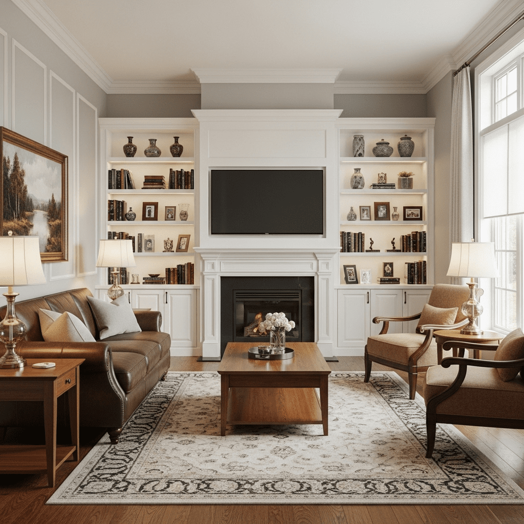 A traditional brick or stone fireplace with ornate mantel serves as the room’s anchor. Flank it with built-in bookshelves, add a pair of wingback chairs, and hang a gilded mirror above. Rich wood tones and classic upholstery complete this timeless look.