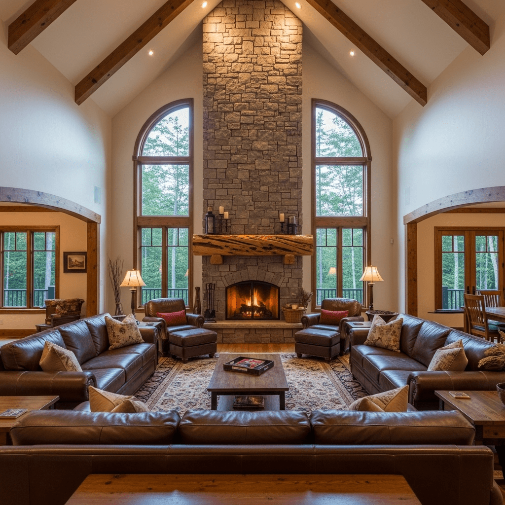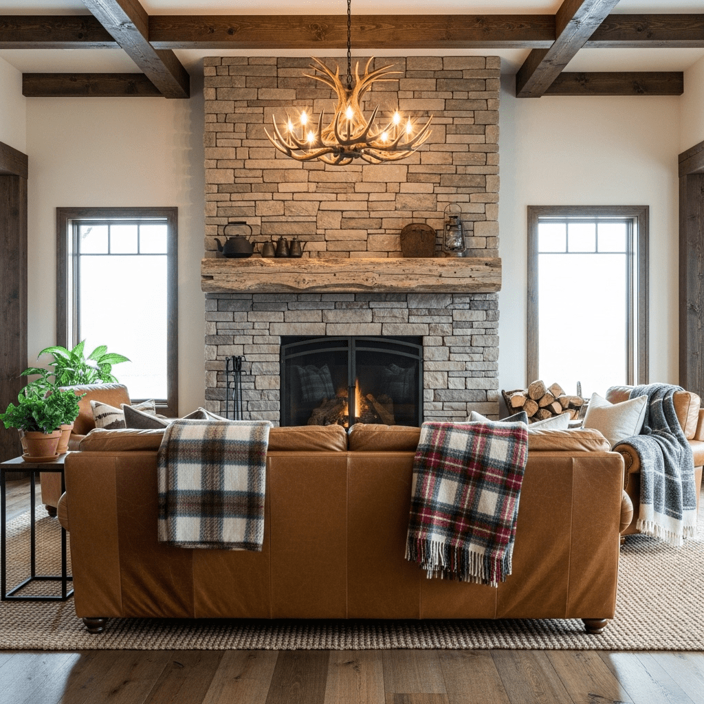 Floor-to-ceiling stacked stone creates a dramatic rustic feature wall. The natural texture and earthy tones bring the outdoors in. Pair with leather furniture, wooden beams, and cozy textiles for cabin-inspired charm.