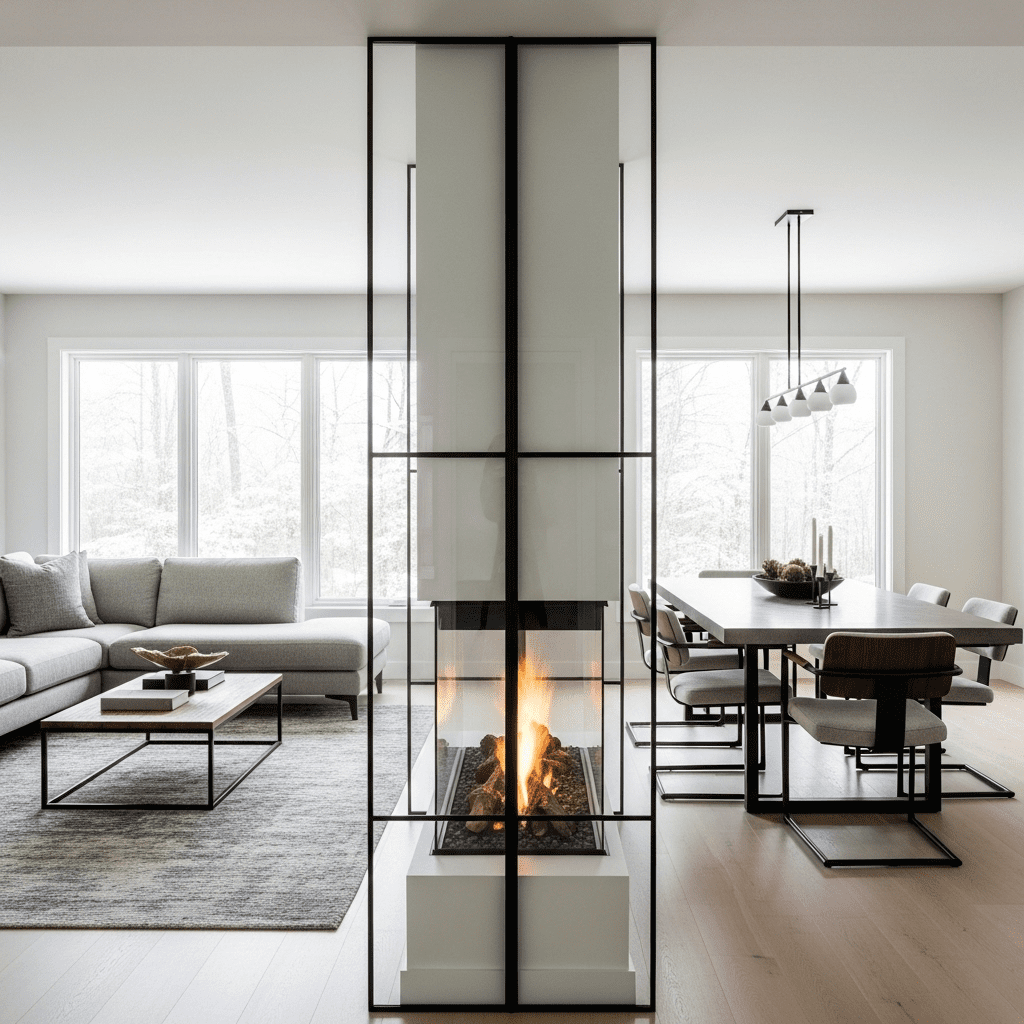 A two-sided fireplace creates a functional room divider while maintaining openness. This design works perfectly between living and dining areas or living room and study. Glass panels on both sides maximize the view of the flames.