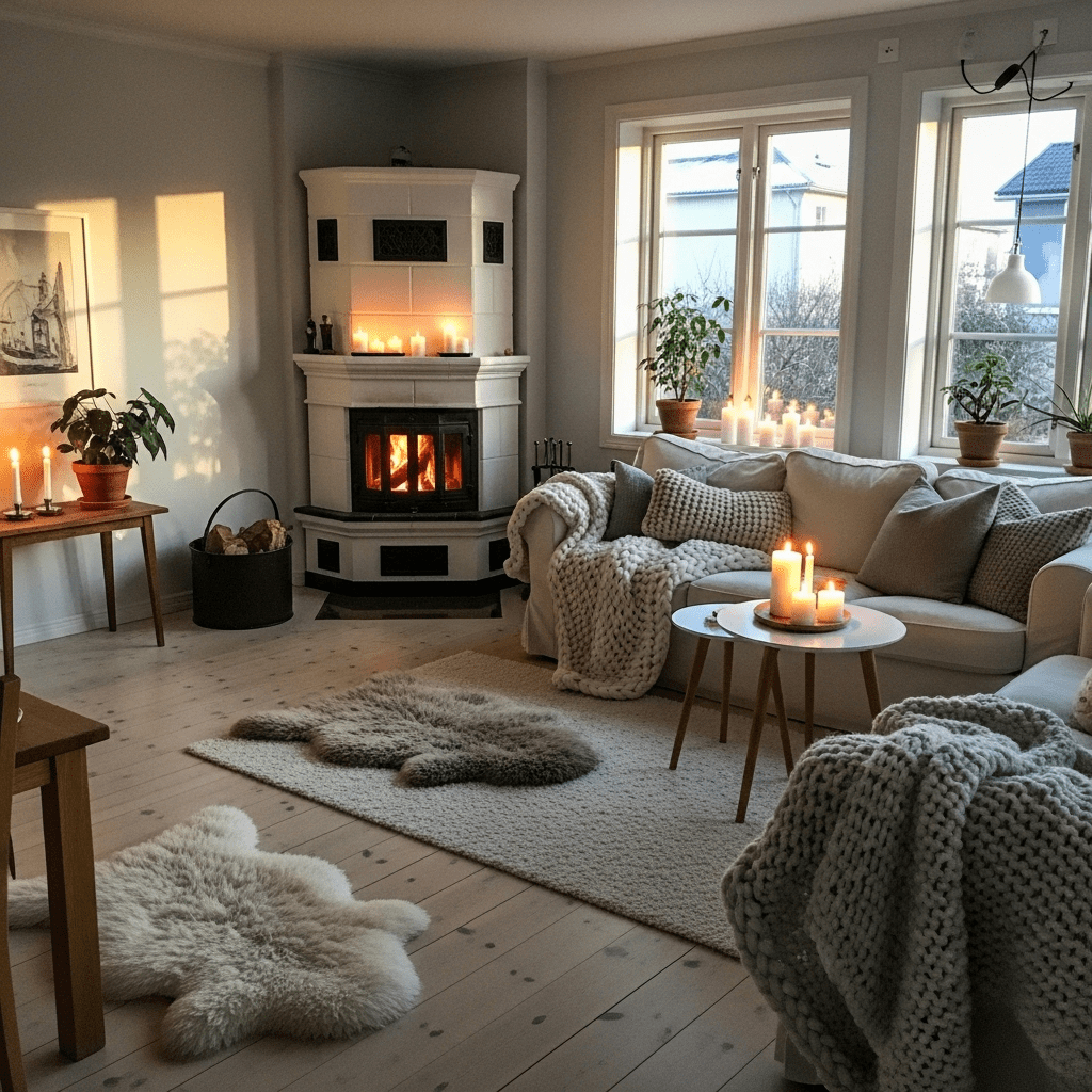 A simple white fireplace in the corner creates a cozy nook. Add a sheepskin rug, chunky knit throws, and minimal Scandinavian furniture. Candlelight and natural wood accents enhance the hygge atmosphere.