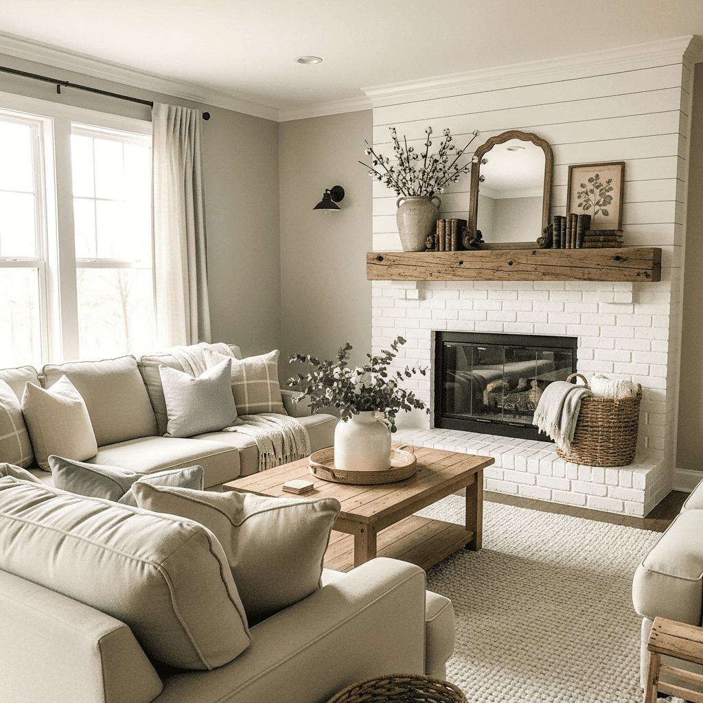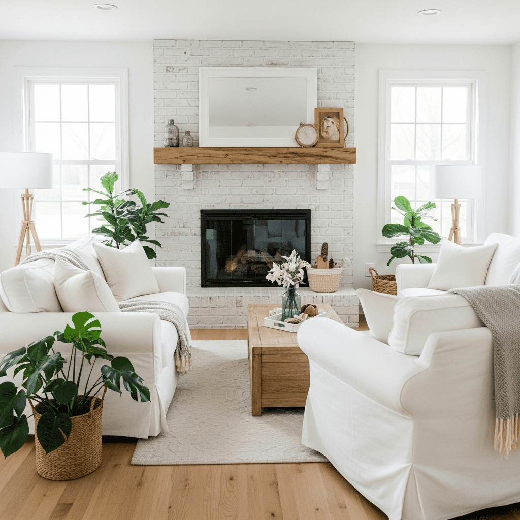 Whitewashed brick offers rustic texture while keeping the space bright and fresh. This technique works beautifully in farmhouse, cottage, or Scandinavian designs. A simple wood mantel completes the look.