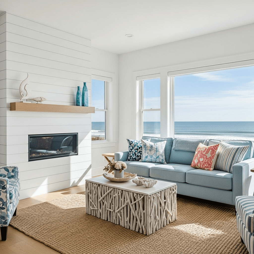 A clean white fireplace with simple lines fits perfectly in coastal design. Surround it with light blue and white tones, natural textures, and driftwood accents. Large windows flood the space with natural light.