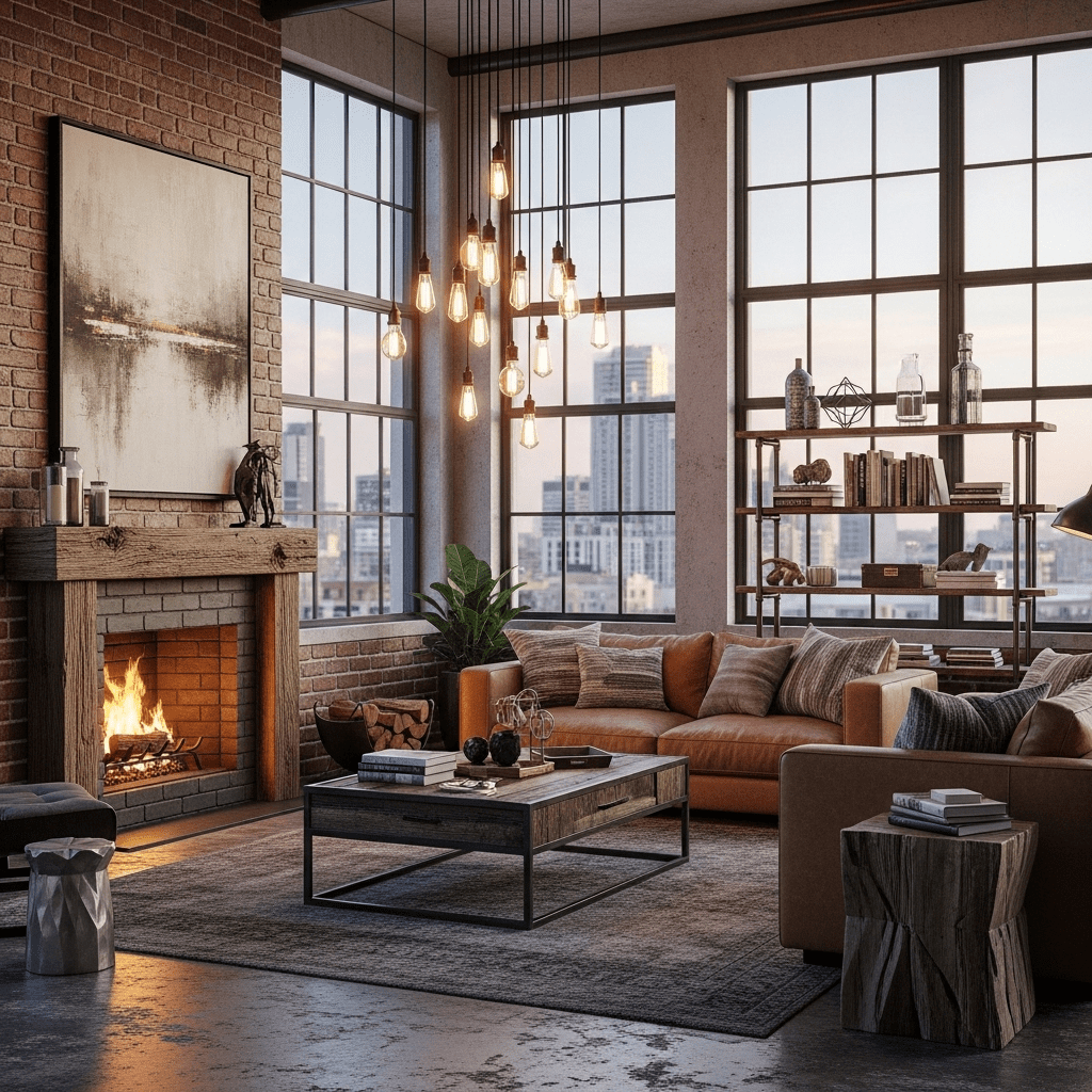 An exposed brick fireplace fits naturally in industrial spaces. Add metal accents, concrete floors, and vintage leather furniture. Edison bulb lighting enhances the urban warehouse vibe.