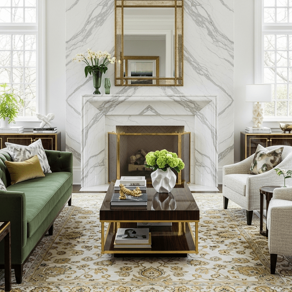 Floor-to-ceiling book-matched marble creates ultimate luxury around the fireplace. The dramatic veining becomes living artwork. Pair with velvet furniture and metallic accents for glamorous sophistication.