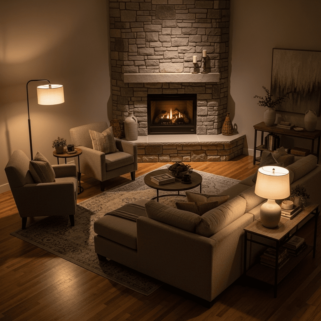 Layer lighting to complement the fireplace glow—ambient lighting for general illumination, task lighting for reading areas, and accent lighting to highlight architectural features. During warmer months, style your fireplace with candles, greenery, or decorative screens to keep it visually interesting year-round.