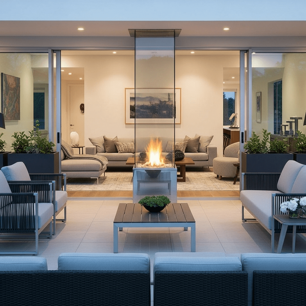 A see-through fireplace connecting indoor living space to outdoor patio extends living areas seamlessly. Glass panels allow flame viewing from both sides while providing weatherproofing.