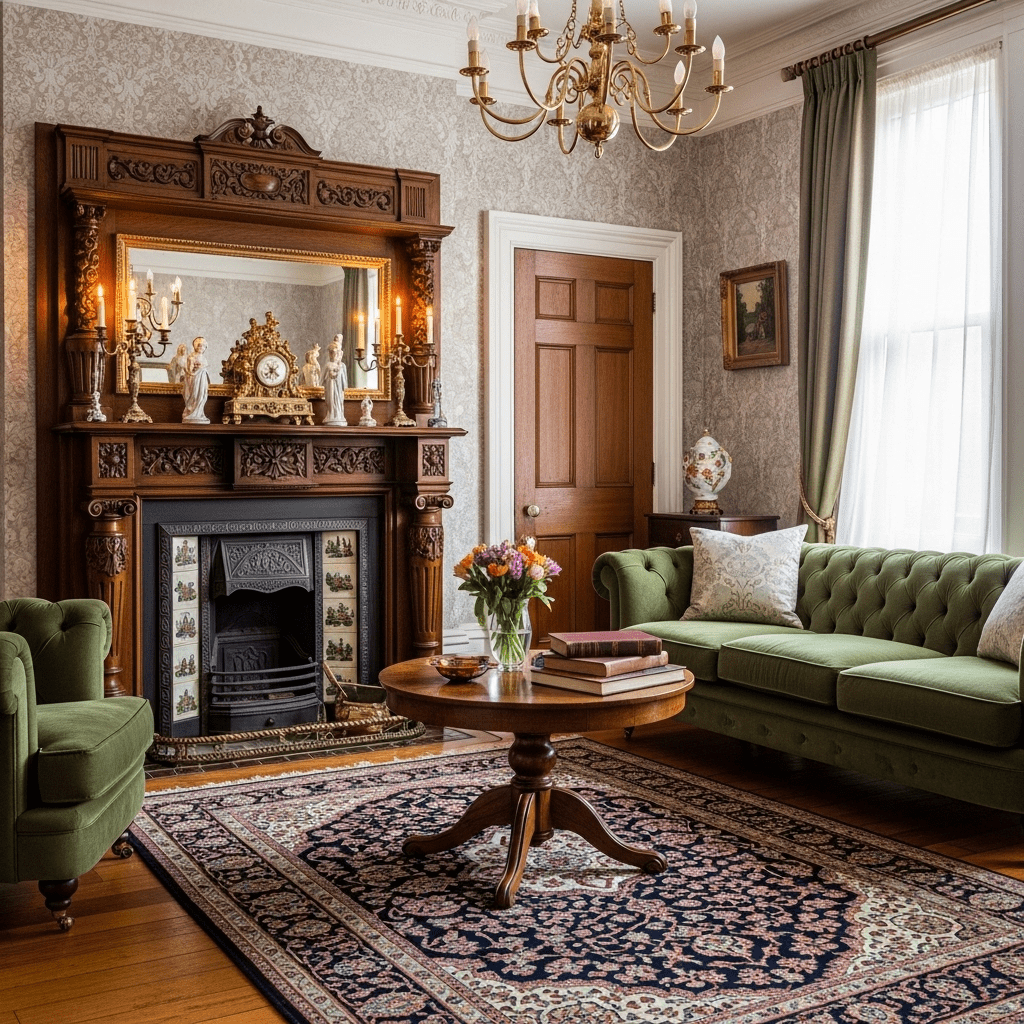 An antique or vintage fireplace mantel brings character and history to the space. Ornate carvings, aged wood, or Victorian tile work create a one-of-a-kind feature. Style the mantel with curated vintage finds.