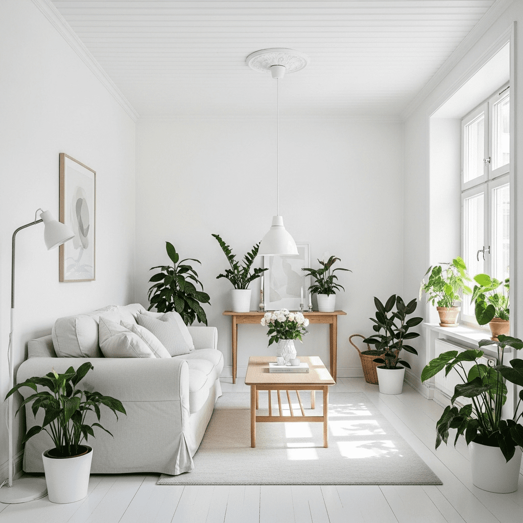Use warm whites like “White Dove” or “Alabaster” to prevent coldness. Layer textures through furniture and textiles to avoid flatness. The continuous white creates an airy, Scandinavian-inspired retreat.