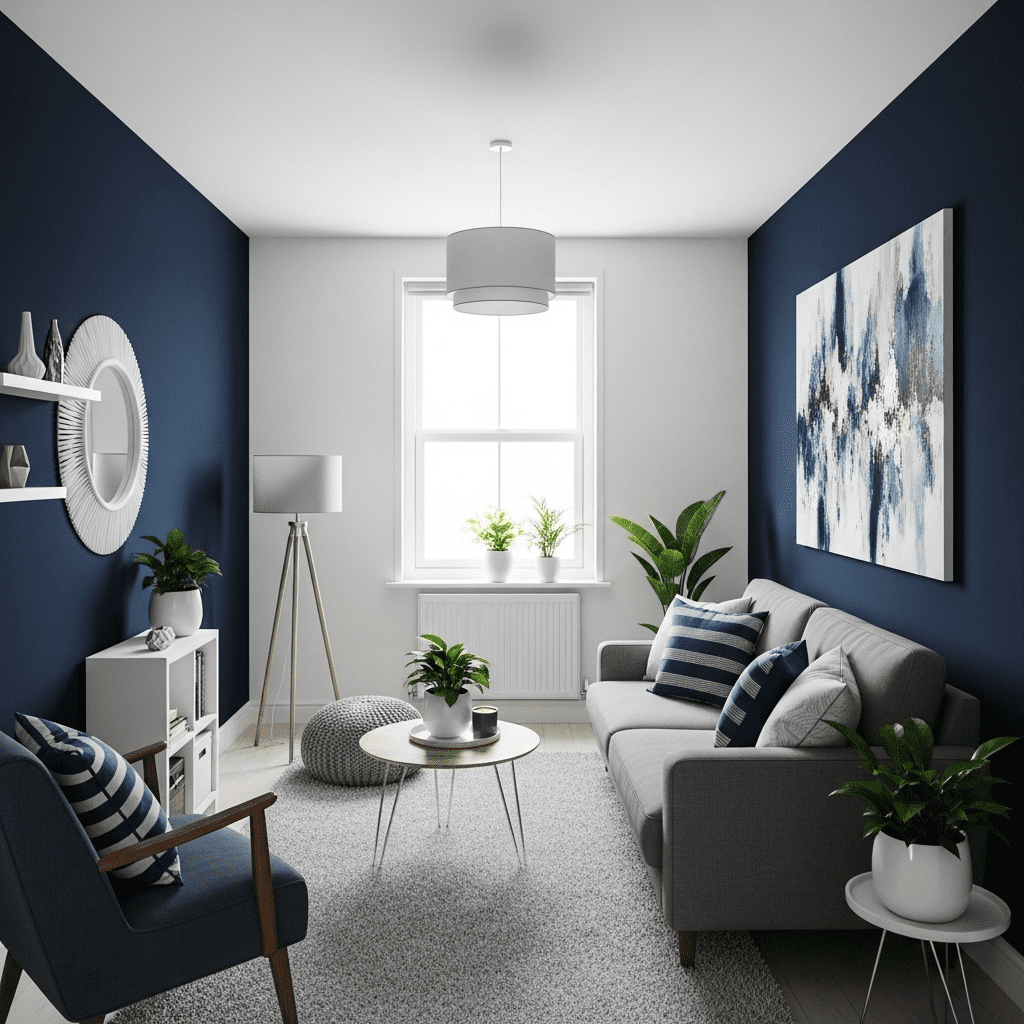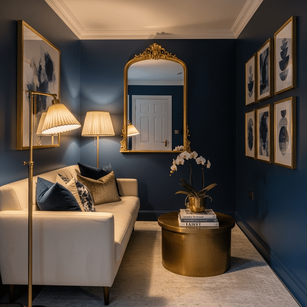 Paint walls in “Hale Navy” or “Naval” for jewel-box elegance. Pair with cream furniture and brass accents. Add abundant lighting to prevent darkness. The bold navy transforms narrow into intimate.