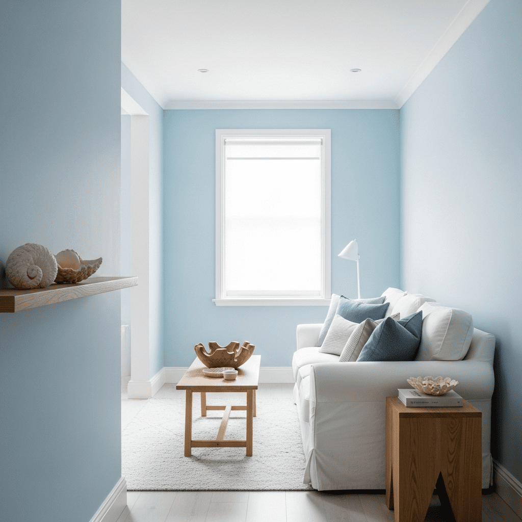 Choose shades like “Palladian Blue” or “Borrowed Light.” Pair with white trim and natural materials. The cool tone creates fresh, coastal-inspired serenity perfect for narrow spaces.