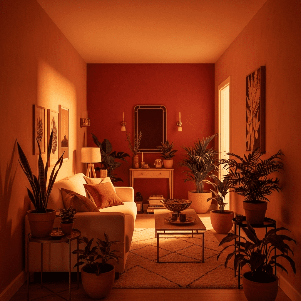 Use colors like “Cavern Clay” or “Adobe Orange” on walls. Pair with cream furniture and natural textures. The warm orange-brown creates perpetual golden hour glow.