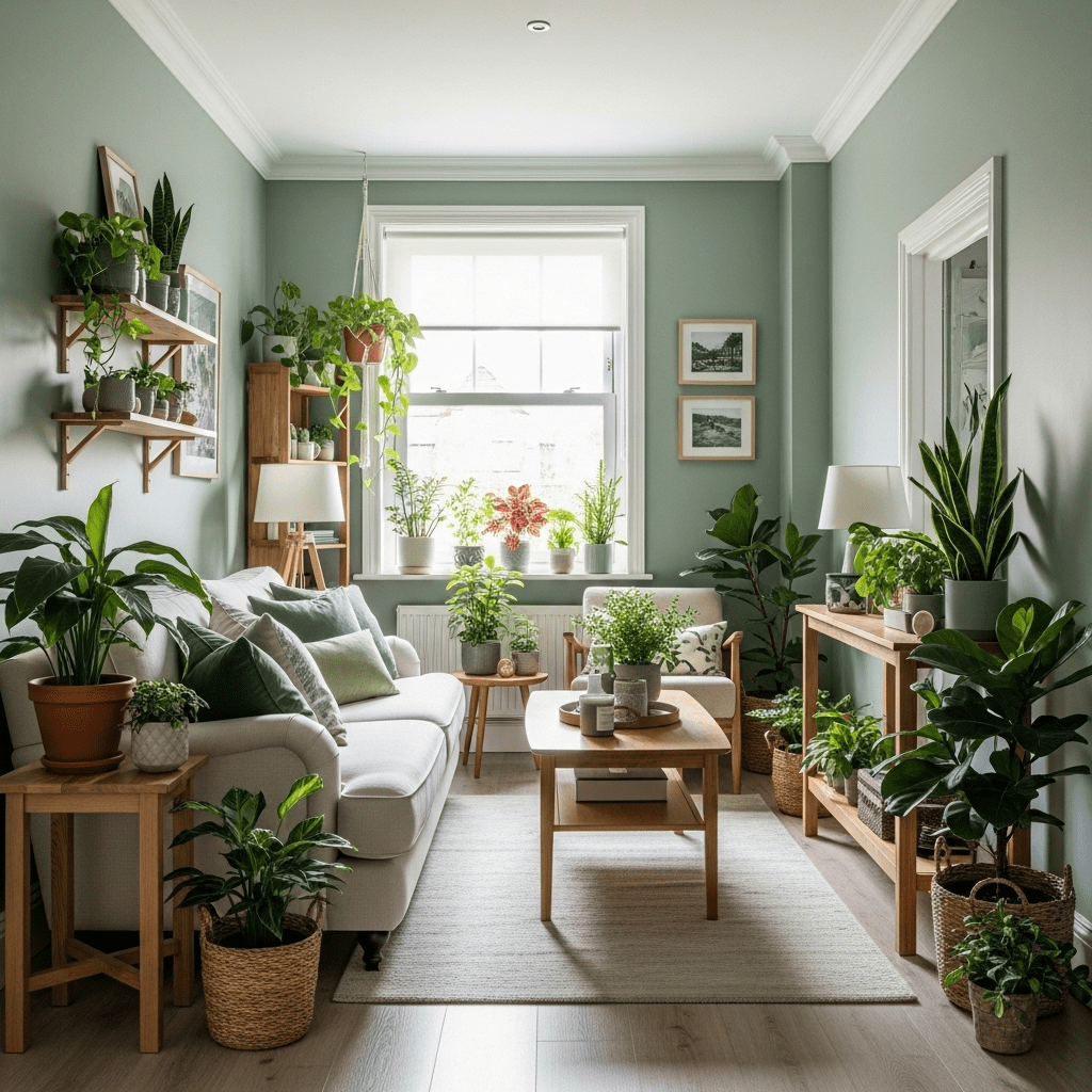 Paint walls in “Clary Sage” or “Saybrook Sage.” Combine with natural wood, cream upholstery, and abundant plants. The muted green creates fresh, modern botanical atmosphere.