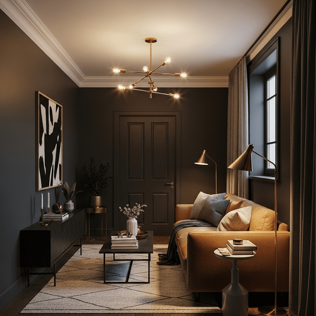 Use “Kendall Charcoal” or “Peppercorn” with lighter furniture creating contrast. Layer warm lighting and metallic accents. The dark walls embrace narrow proportions with confident sophistication.