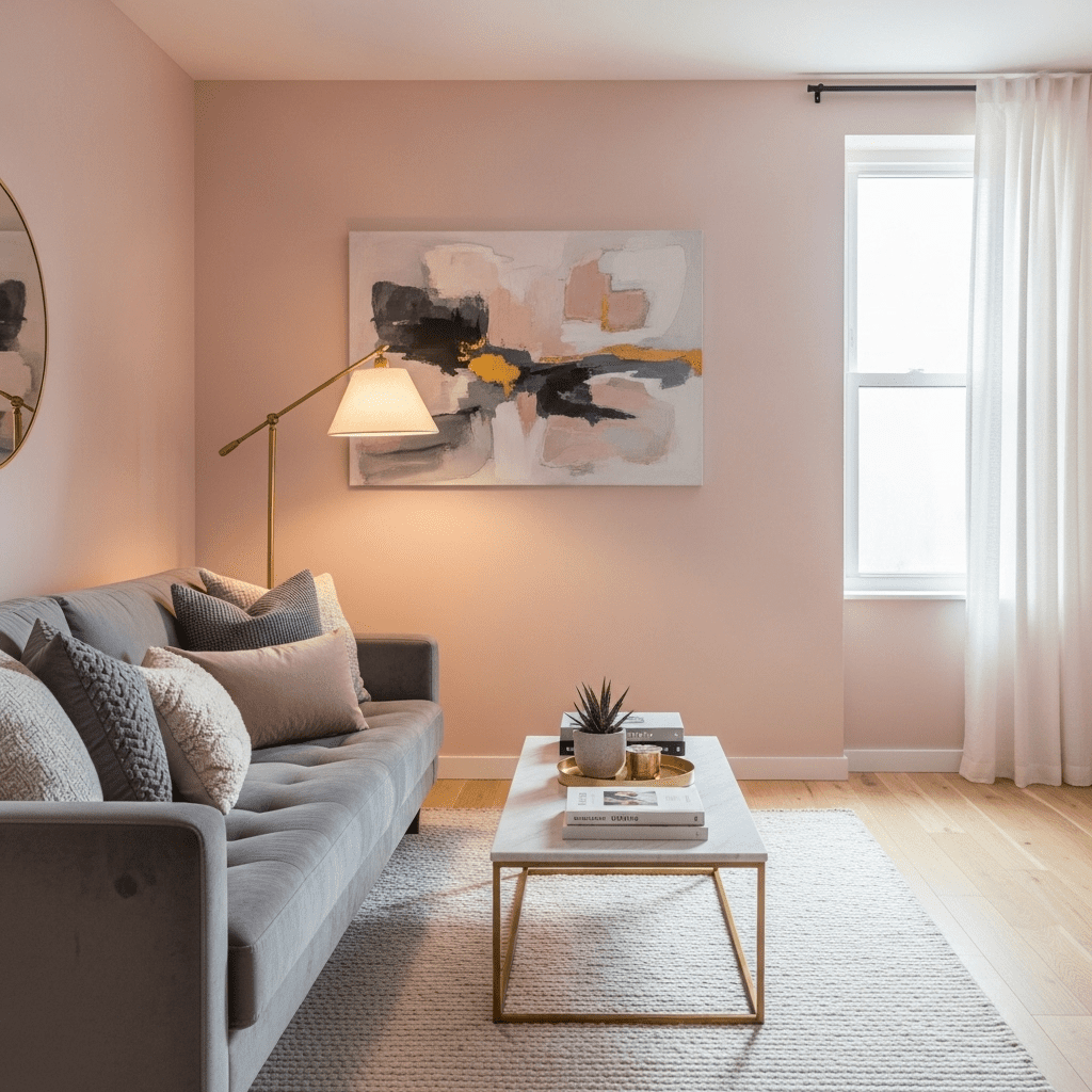 Add subtle warmth with soft blush pink walls that feel contemporary and cozy.
