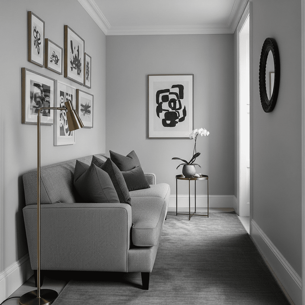 Layer light gray walls with medium gray furniture and dark gray accents. The tonal variation creates depth without color. Add warmth through wood and brass.