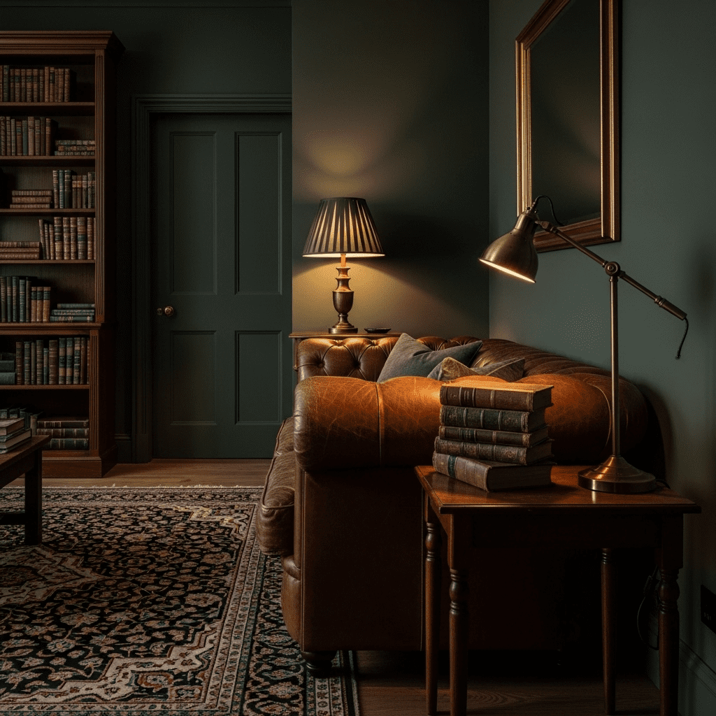 Create rich, library-like atmosphere with deep forest green walls.