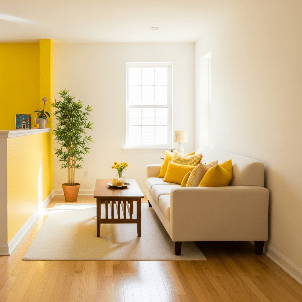 Paint one short end wall sunny yellow while keeping other walls neutral.