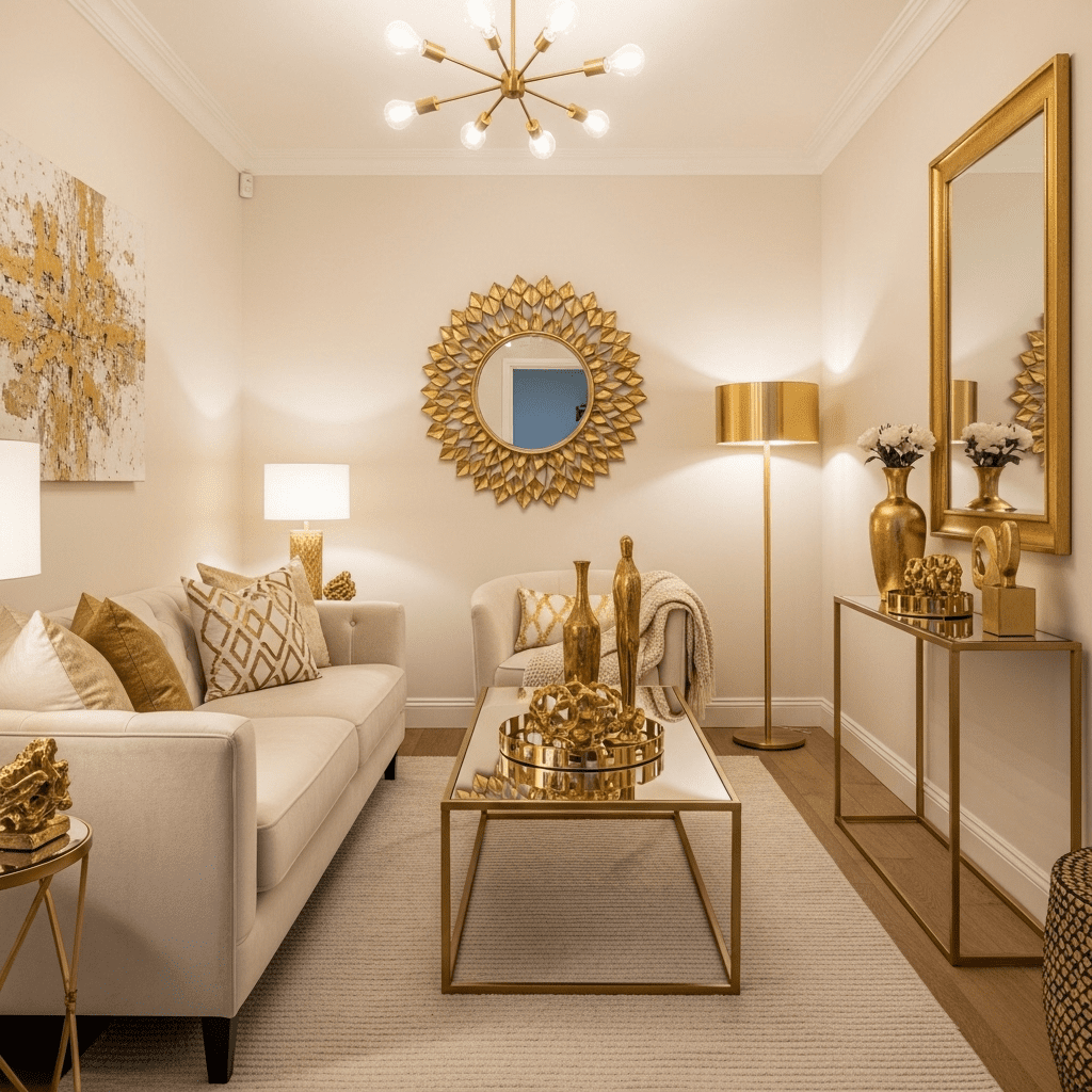 Paint walls in rich cream with honey undertones. Layer gold lamps, frames, and accessories. The warm palette with metallic shimmer creates luxurious coziness.