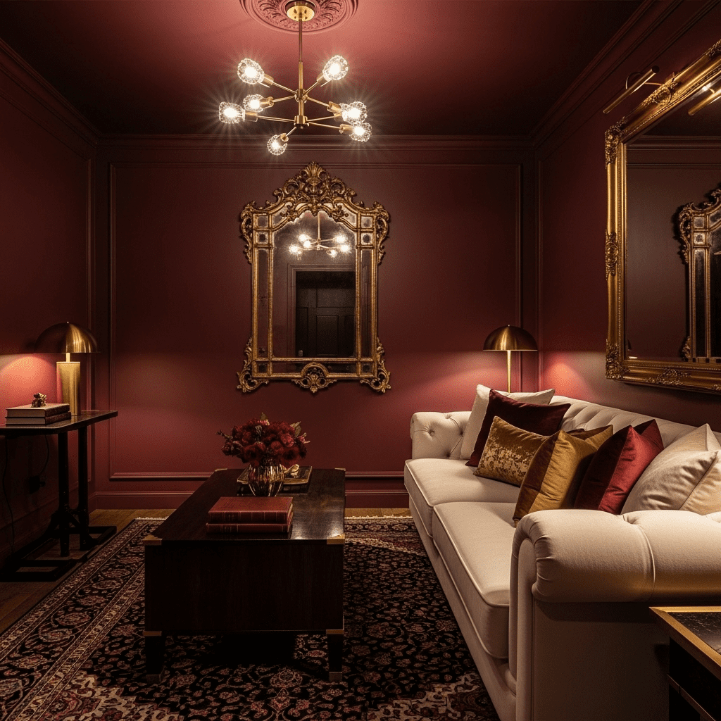 Paint in rich wine tones for dramatic elegance. Pair with cream or gold accents. Add warm lighting that makes the color glow. The deep red creates intimate luxury.