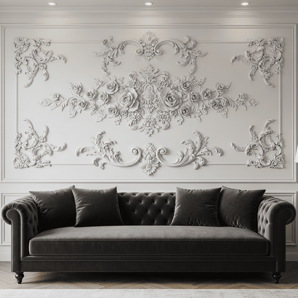 Intricate POP floral motifs on feature walls create classical elegance. Hand-carved or molded flower patterns add dimensional beauty and traditional sophistication to accent walls.