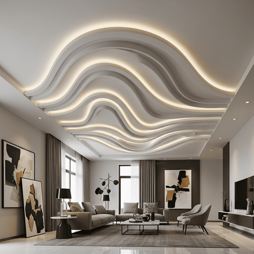 Flowing curved lines across ceilings create dynamic movement and organic visual appeal. These sculptural waves add contemporary elegance while softening rectangular room geometries.