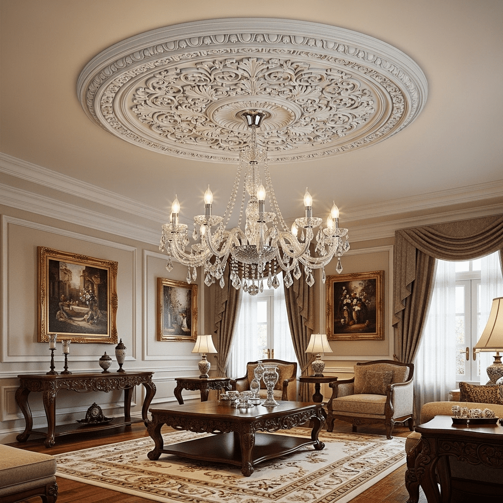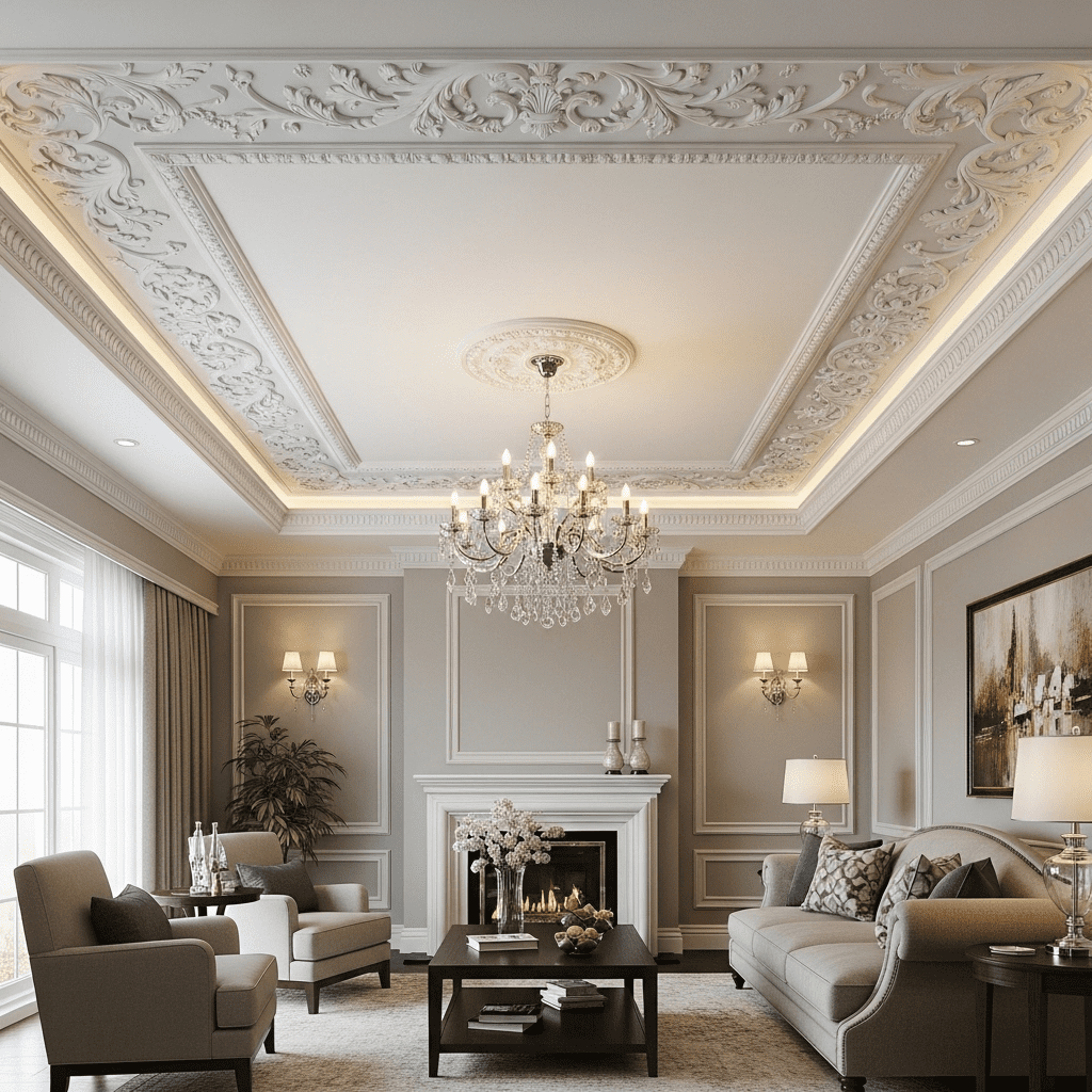 Traditional Classical: Ornate moldings, medallions, cornices, and floral details reflecting classical European architecture.