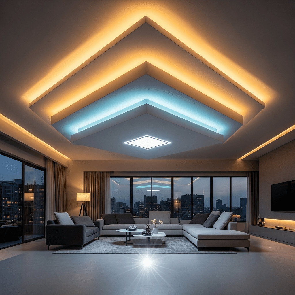 Cove Lighting: Concealed LED strips in recesses creating indirect ambient glow around ceiling perimeters.