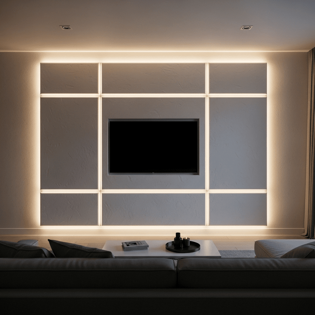 TV Unit Backdrop: Dimensional POP panels framing televisions with integrated lighting creating feature walls.