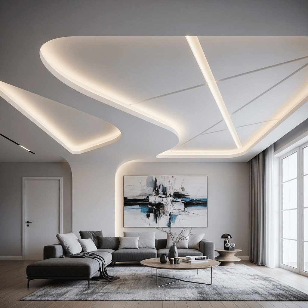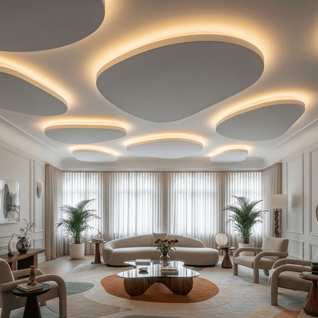 Flowing, irregular organic shapes mimicking clouds, leaves, or water create artistic ceiling treatments. These sculptural designs make bold contemporary statements.