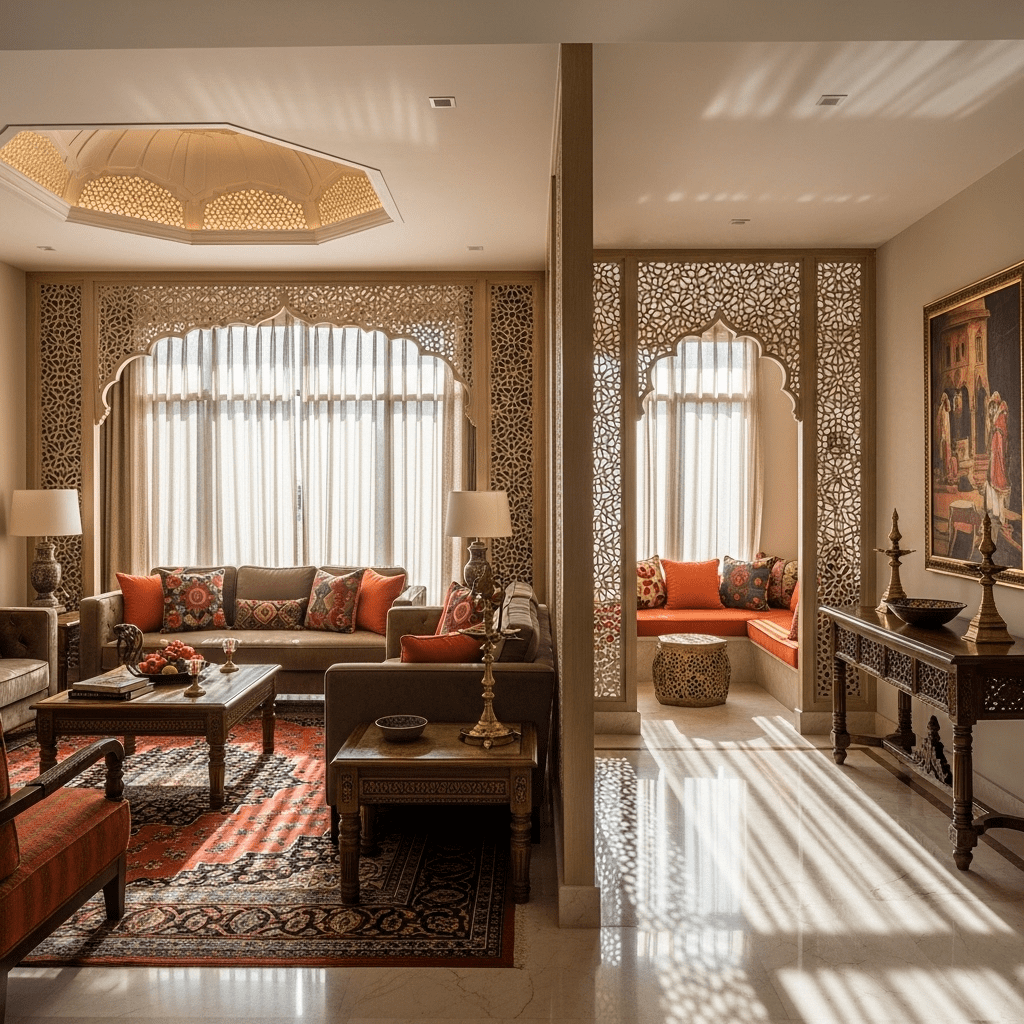 Indian Fusion: Incorporating jaali patterns, traditional motifs, and cultural elements with contemporary forms.