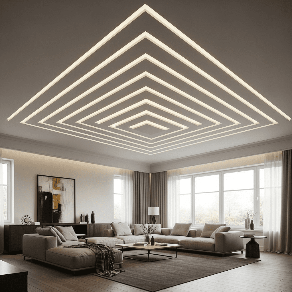 Concentric rectangular frames descending toward center create perspective depth. This geometric approach emphasizes room proportions while adding contemporary elegance.