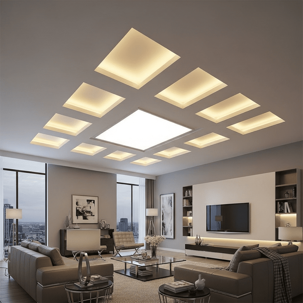 POP framework creating geometric sections housing LED panel lights. This modern approach combines architectural detail with efficient contemporary lighting.