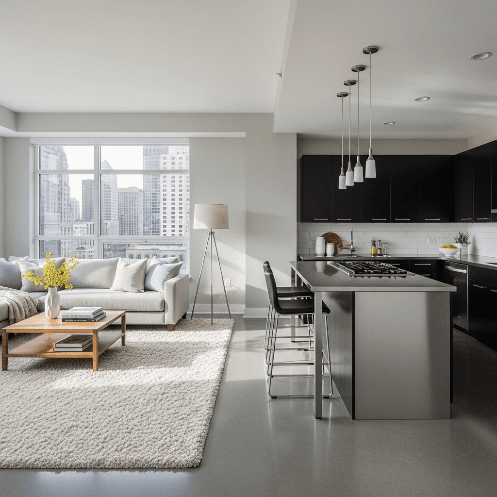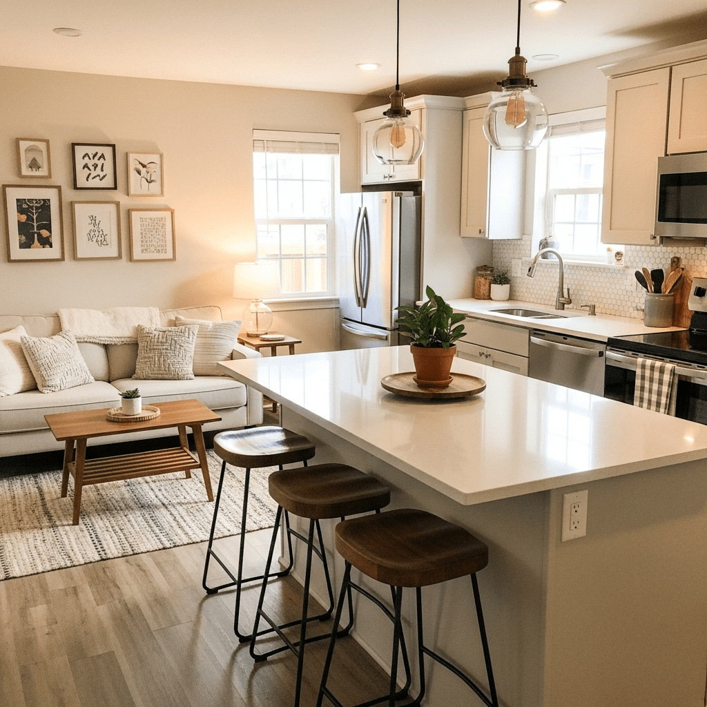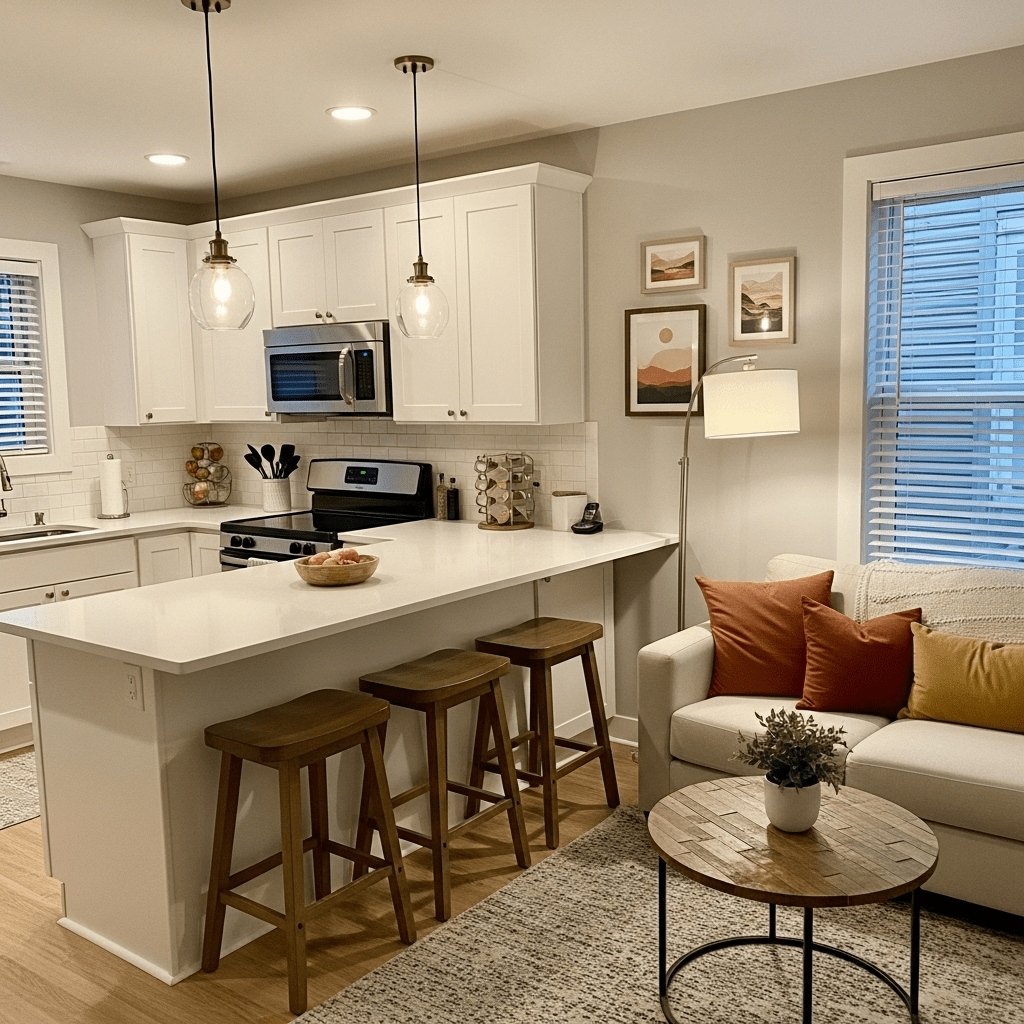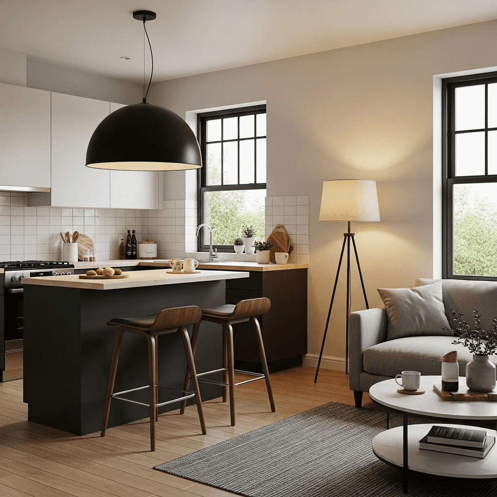 Hang a dramatic pendant over the kitchen counter and use a low-profile floor lamp in the living room. Different “lighting heights” create invisible rooms without the need for walls.