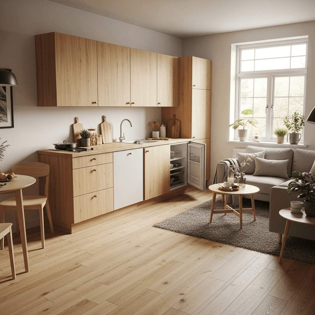 Use the same flooring—such as light oak planks—throughout both the kitchen and living area. This lack of a visual break makes the combined footprint feel significantly larger.