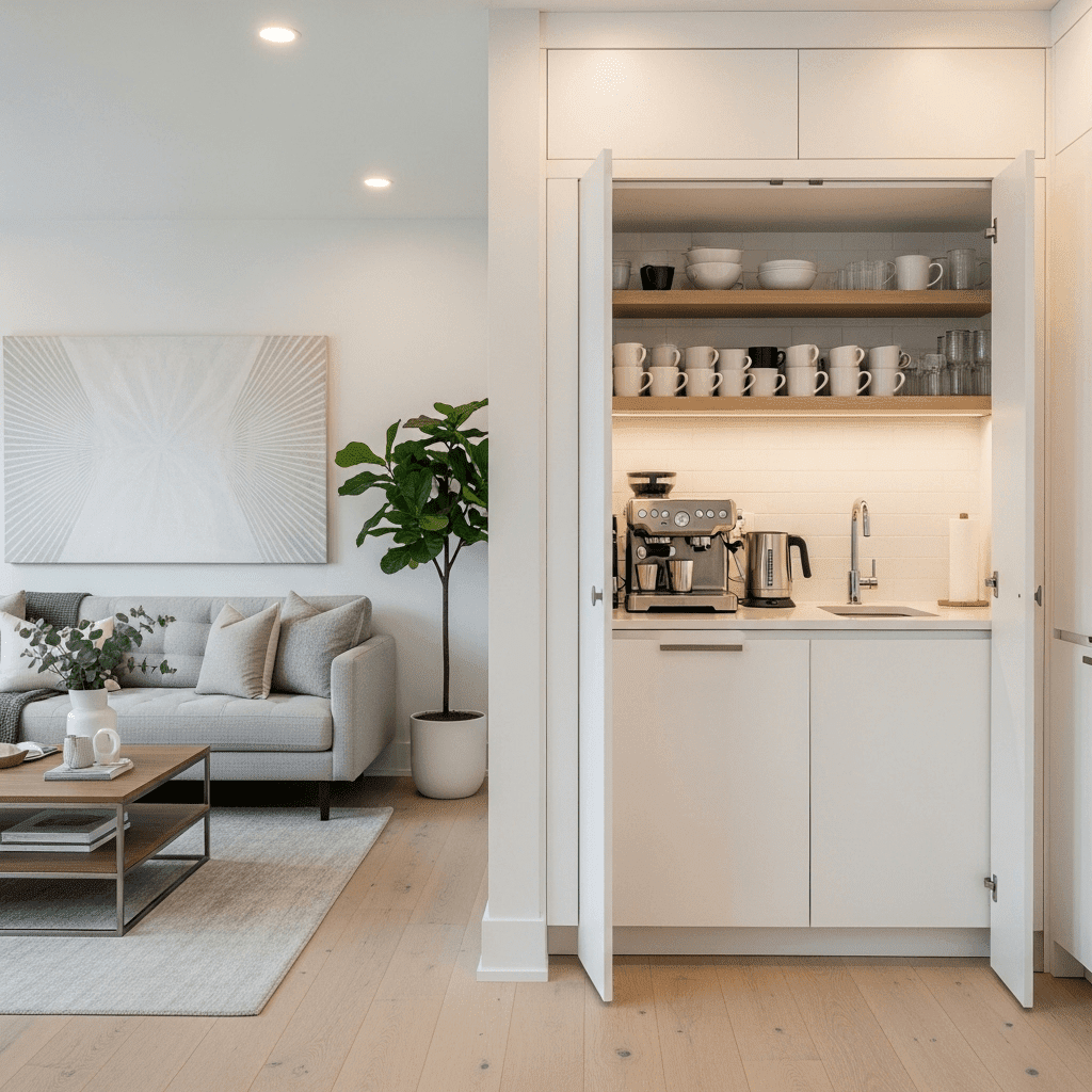 In a small combo, kitchen clutter can make the living room feel messy. Use pocket doors or cabinets to hide small appliances like toasters and coffee makers when they aren’t in use.