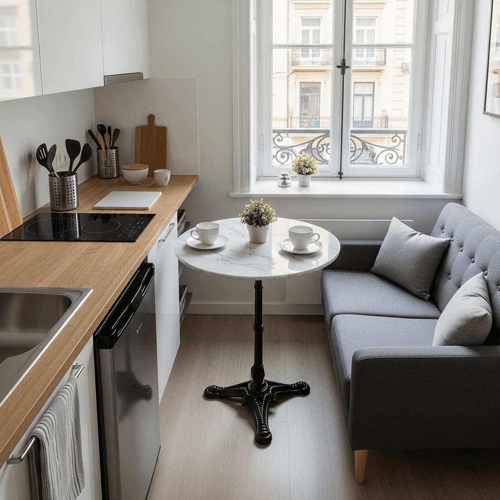 Place a small round pedestal table between the kitchen and the sofa. This acts as a “bridge” that functions for both dining and as a transition point between the two spaces.