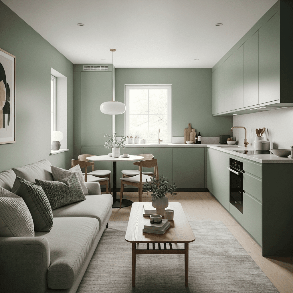 Choose kitchen cabinets that match the color of your living room walls. This “camouflage” technique makes the kitchen feel like a built-in furniture piece rather than a separate utility room.