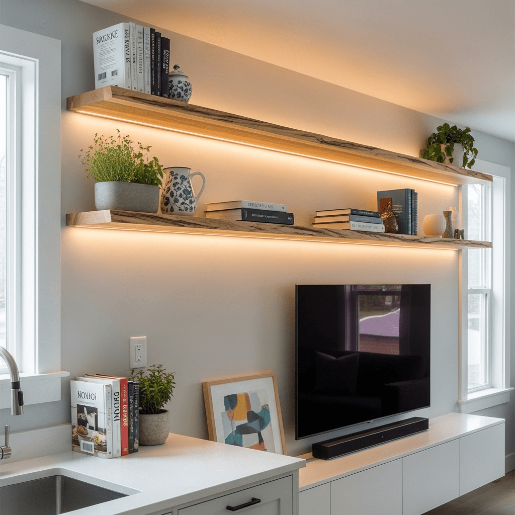Run a series of floating shelves across the entire main wall, spanning from the kitchen backsplash all the way into the living area to tie the two zones together.