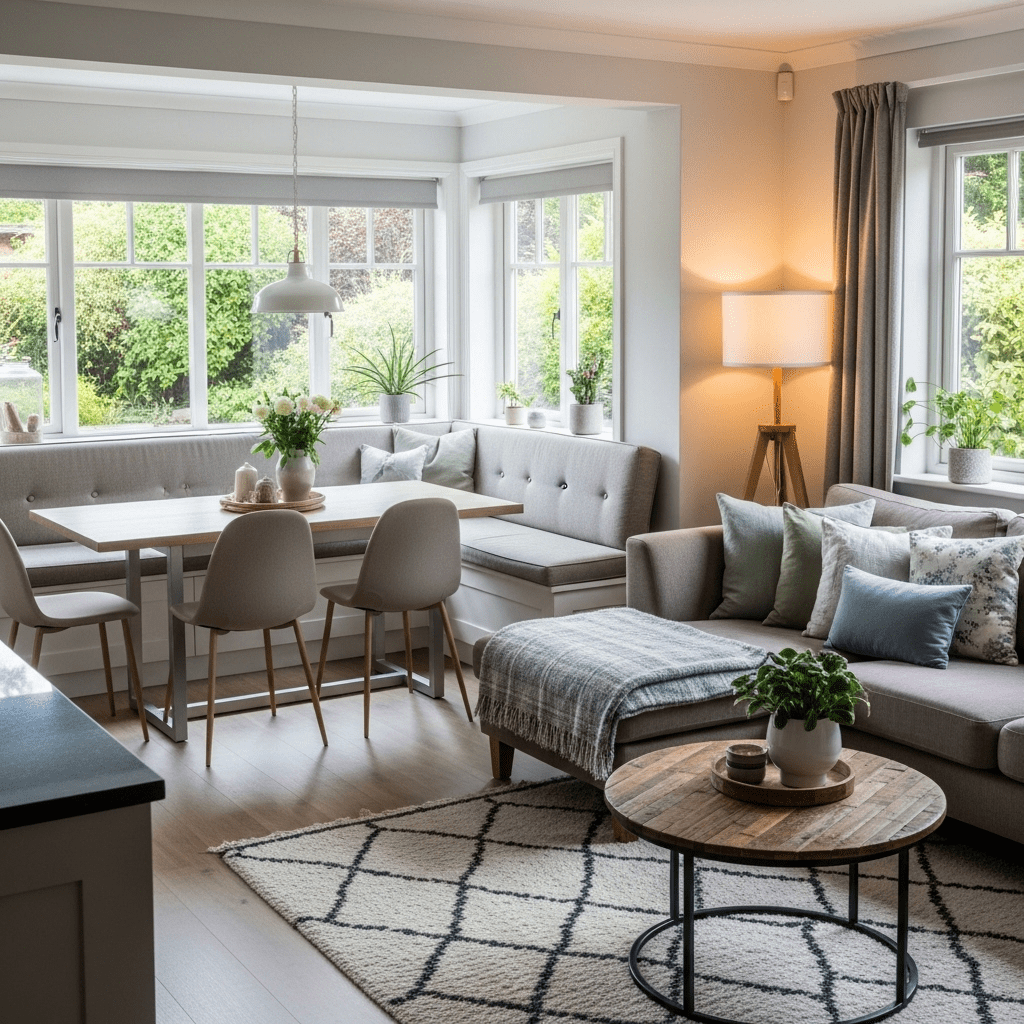 If the combo room has a window, build a banquet seat under it. This provides a dining spot that takes up zero floor space, leaving more room for a full-sized sofa.