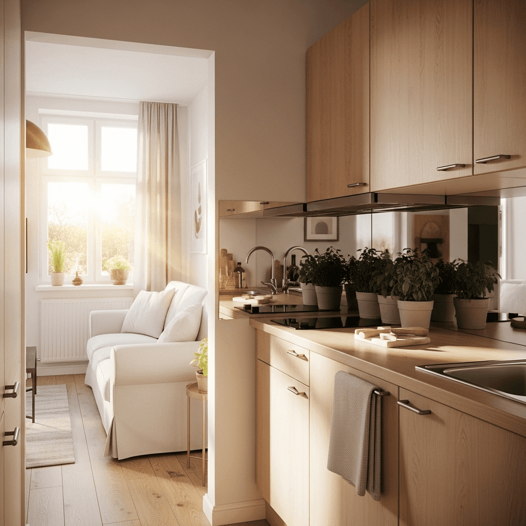 Use a mirrored backsplash in the kitchen. It reflects the living area and the windows, making the kitchen side of the room feel deep and airy rather than closed-in.